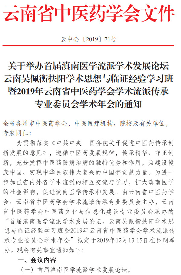 關(guān)于舉辦首屆滇南醫(yī)學(xué)流派學(xué)術(shù)發(fā)展論壇云南吳佩衡扶陽學(xué)術(shù)思想與臨證經(jīng)驗學(xué)習(xí)班的通知
